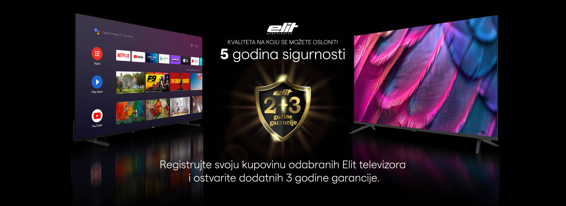 ELIT televizori spajaju vrhunsku tehnologiju i moderan dizajn kako bi vaš doživljaj gledanja bio na najvišem nivou. A uz produženu garanciju od 5 godina, sigurni ste da će kvalitet trajati dugo nakon prvog uključivanja.