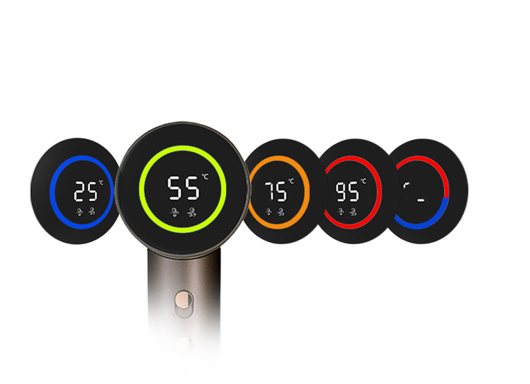 Pregledan zaslon na kojem možete pratiti infomacije kako ste podesili svoju aurru. Pratite temperaturu i jačinu puhanja koje je popraćeno elegantnim krugom koji mijena boje ovisno o temperaturi.